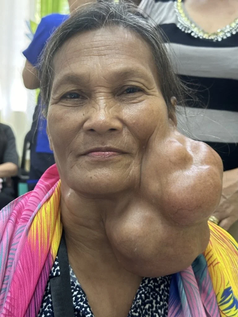This woman presented with a massive tumor that originated from her left parotid gland (salivary gland in the cheek). She said that the mass had been present and growing for over 40 years. Because she never had any pain associated with this tumor, she did not ever seek medical advice. In fact, she said that we were the first doctors that she had ever seen in her life. When her family saw the advertisements in the community about an upcoming Aloha Medical Mission to the region, they encouraged her to seek treatment. She was evaluated by local healthcare providers and a biopsy was done that confirmed that the mass was a benign salivary gland tumor.